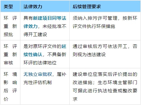 在建設項目環境影響評價管理過程中,環評重新報批、重新審核和環境影響后評價是三種不同的制度安排,它們在定義、適用情形、審批流程和要求、以及法律效力和后續管理要求方面存在顯著差異。以下將結合相關法規文件內容逐一進行比較分析: